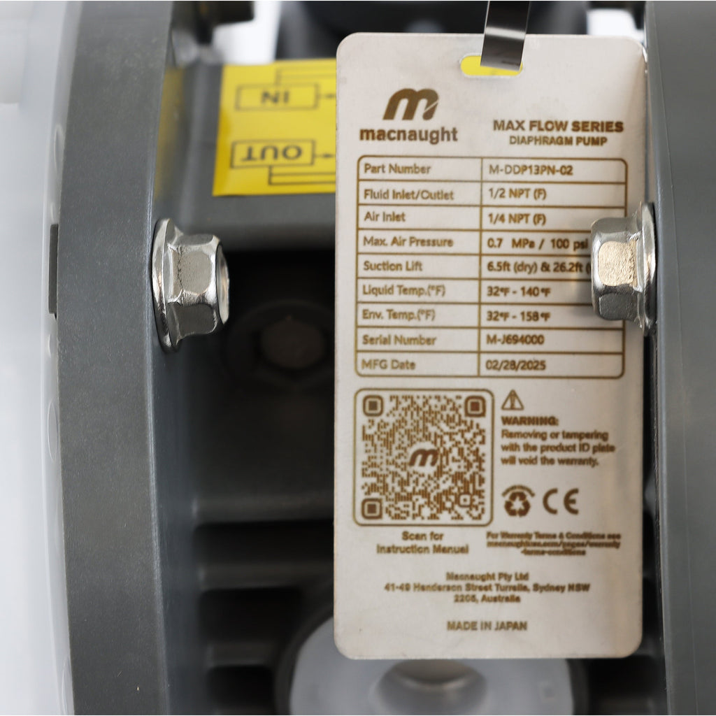 Experience the next level of efficient fluid transfer with our Max Flow Double Diaphragm Pump Series. Designed and manufactured in Japan, the Macnaught Max Flow range delivers industrial-grade process pumping solutions. This 1/2” Air Operated Double Diaphragm Pump operates at a 1:1 ratio with a maximum flow rate of 16 GPM, ensuring high-volume output with low air consumption. Includes a 5-Year Pump Body Warranty.